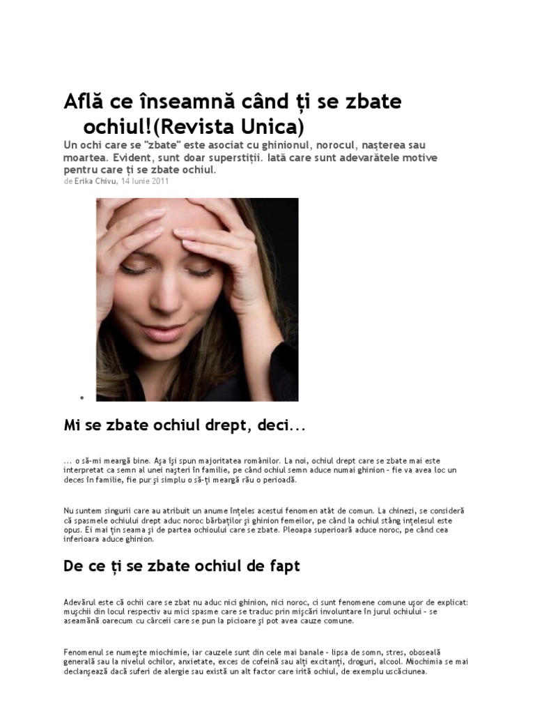 Adevarul este ca ochii care se zbat nu aduc nici ghinion, nici noroc, ci sunt fenomene comune usor de explicat: Ce înseamnă atunci când ți se zbate ochiul? Din ce cauze se zbate ochiul stâng mai des.